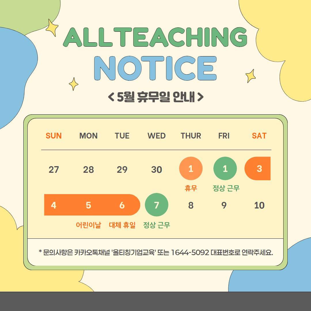 5월 5일(월)~6일(화) 어린이 날 및 대체공휴일 휴무
