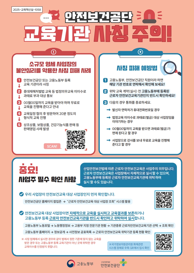 안전보건교육기관 사칭 주의 안내